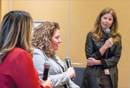 Paige Mullis of MMI Textiles (right) led a panel discussion on business uses of artificial intelligence that included interaction with the audience as well. Panelists were Xochil Herrera Scheer of The Chicago Pattern Maker and Mary Reardon, also of MMI.
